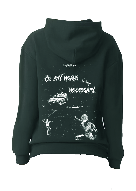 Depicted on the back of this hoodie is a freedom fighter aiming a slingshot at a merkava tank, and a child aiming a slingshot an hermes-900 drone. Original design by Bint el Balad.